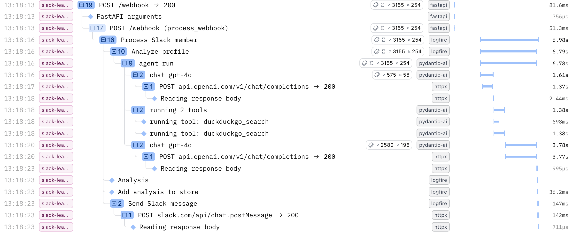We also add Pydantic Logfire to get observability into the app and agent as they're running in response to webhooks and the schedule